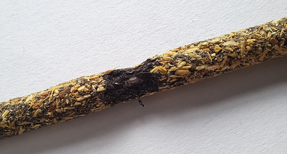 Die Stäbchen sind zwar relativ großzügig mit Palo-Santo-Holzsplittern beschichtet, wie hoch der tatsächliche Anteil davon im Räucherwerkteig ist, ist jedoch schwer zu sagen. Im Inneren sind die Stäbchen fast schwarz. Aufgrund der kurzen Zutatenliste und des Geruchs dürfte es aber eine ordentliche Menge sein.